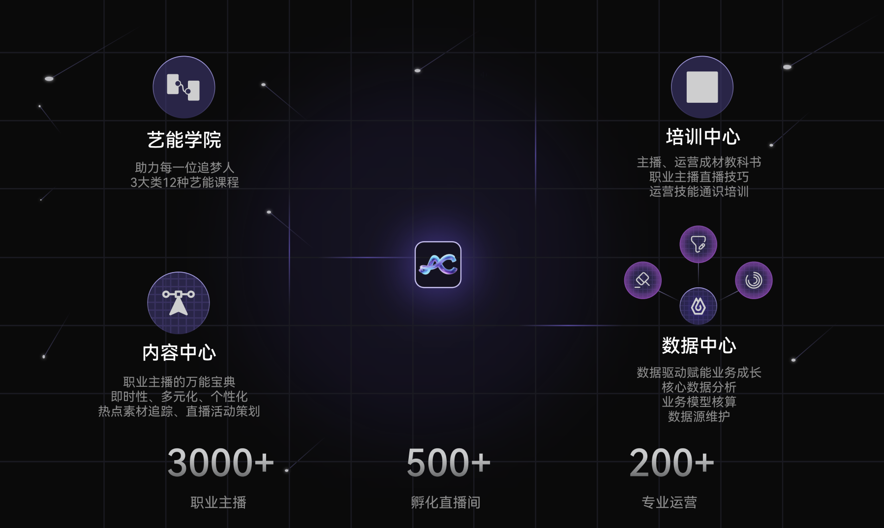 打造全链路生态,以直播、二次元、影视等多板块协同,全程赋能素人成长为网红、IP 或演员,完成从 0 到行业标杆的蜕变。